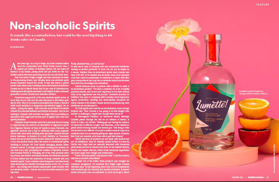 In this feature for Canadian liquor-industry trade magazine Poured I look at one of the hottest new categories in the business—spirits with no alcohol in them. Several founders of pioneering Canadian non-alcoholic spirits brands are featured.
