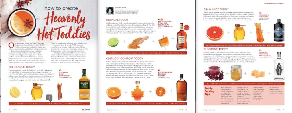 For BC Liquor Stores Taste magazine, I created a grid-style recipe matrix of spirits, sweeteners, citrus and garnish enhancements to make a range of heart-warming winter toddies.