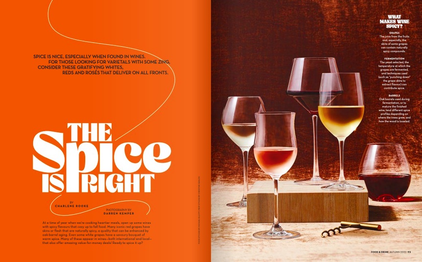 White, rosé and red wines can all be spicy: spice may come from the grape flesh and skins, from winemaking techniques and from use of oak barrels in fermenting and maturing wine. In this LCBO Food & Drink feature I present Ontario and international wines to fire up the fall.
