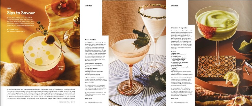 Exploring the savoury/food-inspired cocktails trend in the Autumn 2023 issue of LCBO Food & Drink, using ingredients from MSG and olive oil to avocado, chili paste and more!